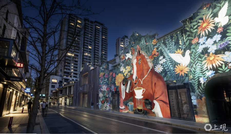 内容:走在南京西路抬头看,能在多个巨幅屏幕上看到活动联动悲鸿作品所创作的光影奔马的贺岁影片,让大家走在静安区,随时随地都能感受到亮丽的城市天空。