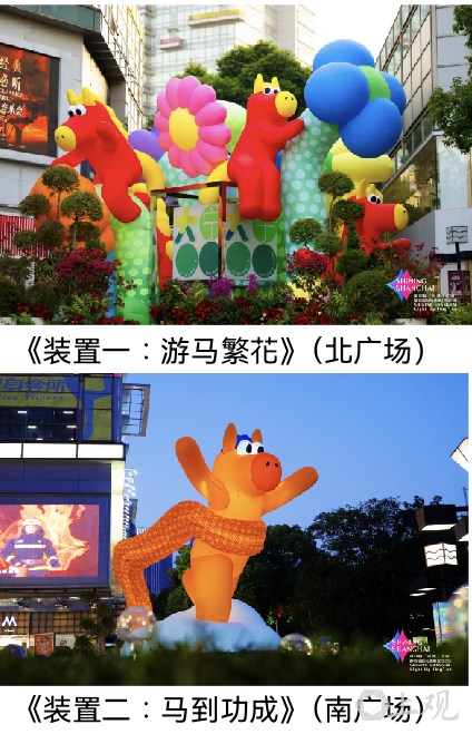 内容:与本次新春光影活动奔马元素相呼应的马年艺术装置《走马嬉春》,其三组装置以《游马繁花》的步步生香、《马到功成》的一马当先、《金福悦马》的福水纳财等吉祥姿态呈现,不同的场景皆诠释着“走马嬉春”的核心意趣,表达对观者新岁马不停蹄、一路繁花、勇往直前、事业腾达、财运亨通的美好祝愿。