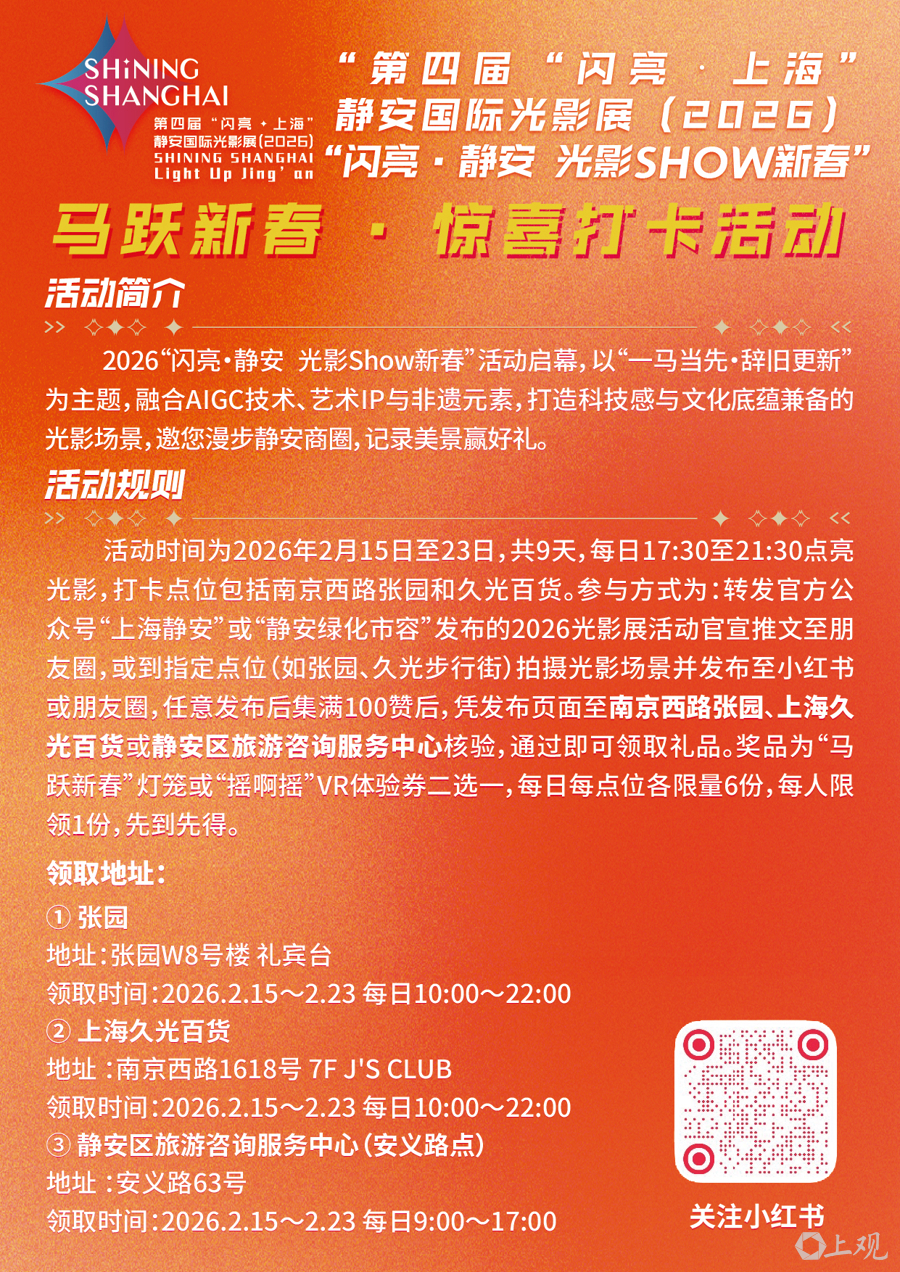 记者今天从静安区获悉,第四届“闪亮·上海”静安国际光影展(2026)之“闪亮·静安 光影SHOW新春”活动于2月15日至2月23日开展,为期九天,每天17:30至21:30点亮。