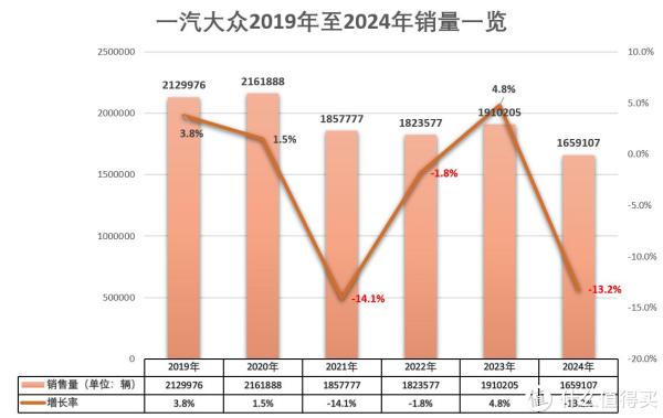 到了2024年,即便有国家有“双新”政策的推动,一汽大众的全年终端销量却仅有165.91万辆,同比下滑13.2%;其中核心品牌“大众汽车”销量同比下滑11.6%至92.80辆,百万年销的神话就此破灭。