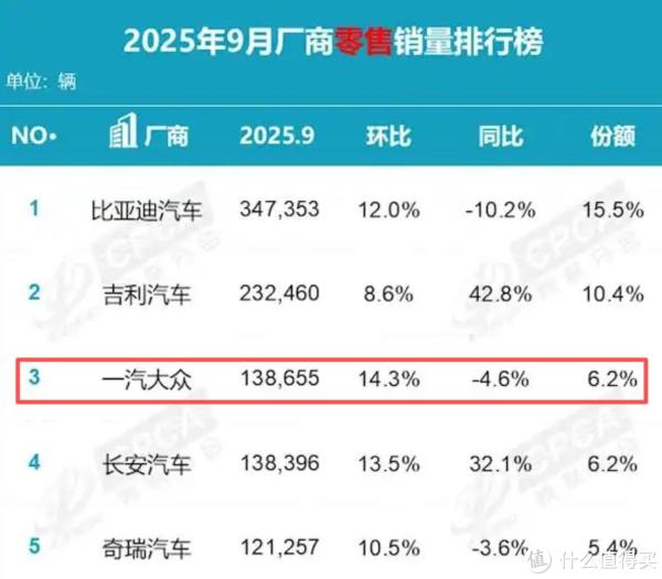 但根据乘联会发布的2025年9月国内汽车品牌销量零售榜,一汽大众9月销量虽然环比增长14.3%,但依旧出现了4.6%的同比下滑;相比之下,位居行业第四的长安汽车则实现了32.1%的同比增长,市场份额与一汽大众旗鼓相当。