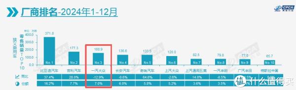 结合乘联会数据可知,曾经跟在比亚迪身后的“销量榜眼”一汽大众被吉利汽车以2024年销售177.3万辆的成绩反超,屈居第三名;且一汽大众是国内厂商零售销量前五名中唯一一家出现负增长的车企,与温和复苏的市场环境格格不入。