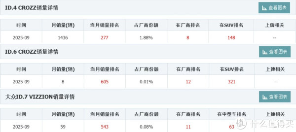 而根据第三方平台“车主之家”发布的数据,一汽大众三款在售的ID.系列新能源车型9月的合计销量仅1503辆,在其单月总销量中的占比仅约1%。其中ID.4 CROZZ月销超过千辆,而ID.6 CROZZ的月销量仅有8辆。