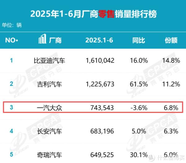 不仅如此,一汽大众也是2025年1-6月国内车企零售销量前十名单中,唯一一家销量回落的厂商,上半年的累计销量为74.35万辆,同比下滑3.6%,销量颓势未能得到根本性缓解,改革成效落地压力犹存。