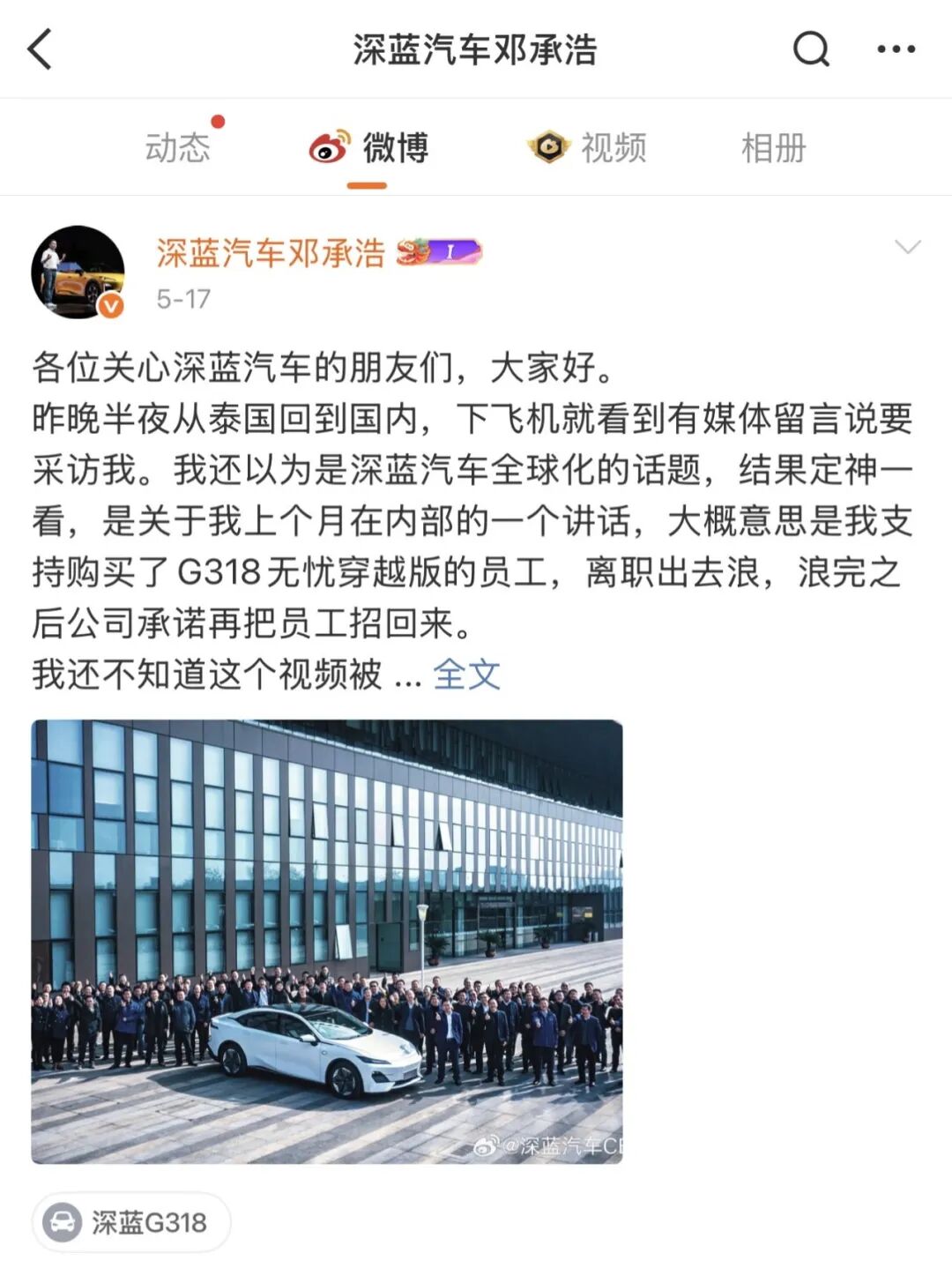 深蓝汽车的案例也具有戏剧性。为拉动员工购车,品牌推出八五折优惠,其董事长邓承浩在今年5月的活动中公开表示,购买G318无忧穿越版的员工可申请离职“野一下”,玩两三个月之后公司再召回返岗。