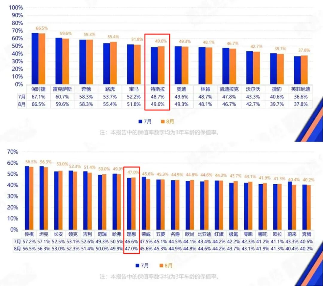 图/2025年8月特斯拉与理想三年保值率钜阵资本